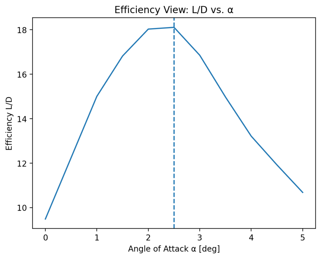 • Aerodynamic efficiency reaches a maximum and decreases noticeably beyond this point.