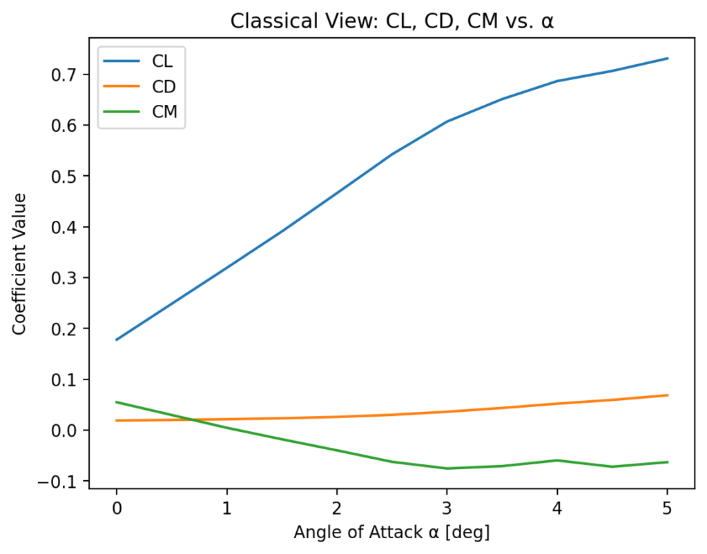 In aerodynamic development, wind tunnel and CFD data are typically evaluated using classical coefficient plots: lift, drag, and moment as functions of angle of attack.