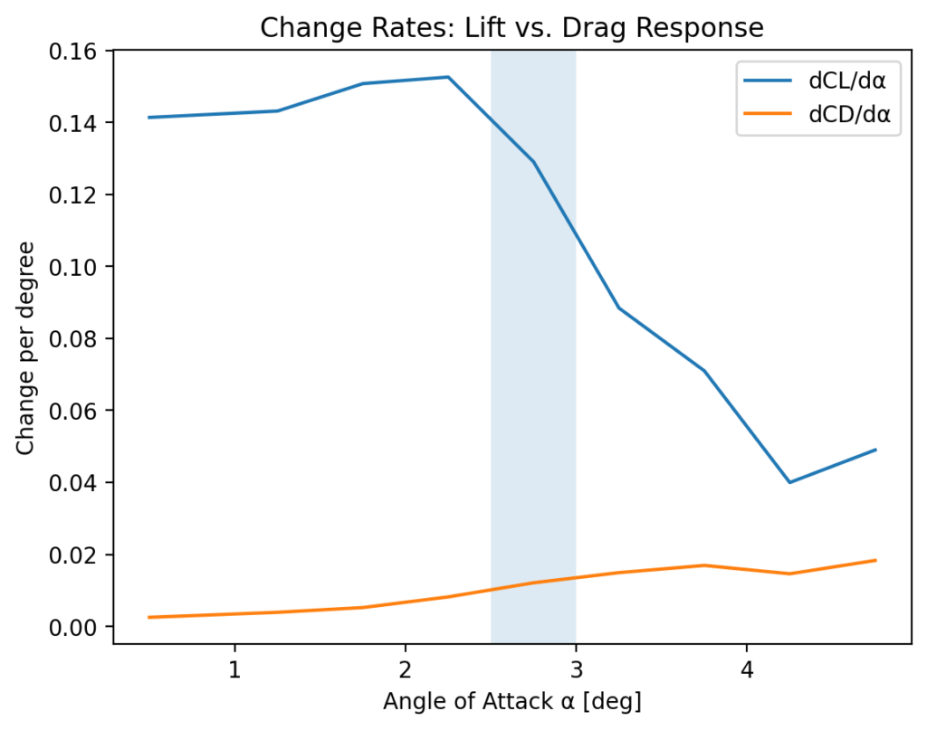 Beyond this point, further increases in angle of attack yield diminishing returns: additional lift is achieved at a disproportionately higher drag cost.